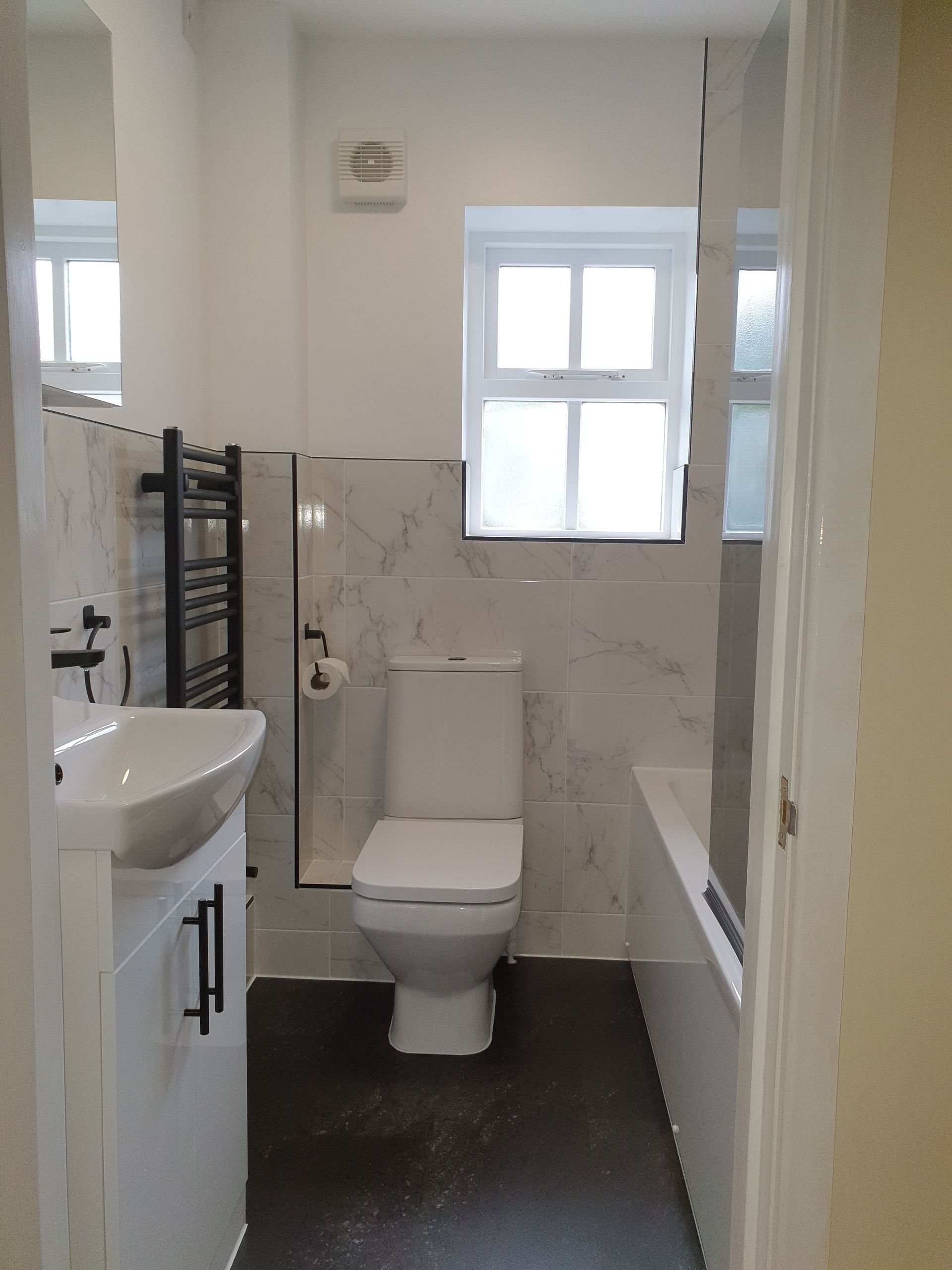 Black & white theme bathroom for client's rental property. White marble effect wall tiles with a black tiled feature wall against the bath. Black taps and wastes, black toilet push button. Black towel rail. Smoked glass bath screen. Black metal tile trims and black LVT floor #bathroom #bathrooms #bathroomsofinstagram #bathroomstyle #bathroominspo #bathroomdesign #bathroomdecor #bathroomrenovation #bathroomremodel #bathroomtiles #bathroomgoals #bathroomideas #bathroomreno #bathroomstyling #renovation #interiordesign #refurbishment #houserenovation #tiles #tiling #showers #baths #toilet #sink #baño #tiling #houser enovationButton